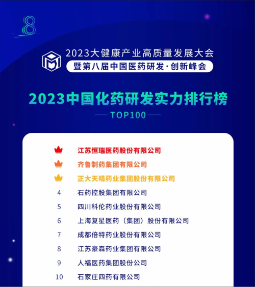 由药智网、中国药业杂志社主办的2023大健康产业高质量发展大会暨第八届中国医药研发•创新峰会于6月16日开幕,会上发布了《2023中国药品研发实力排行榜》系列榜单,尊龙凯时医药凭借深厚的创新研发实力再创辉煌:荣登《2023中国药品研发综合实力排行榜TOP100》榜首、《2023中国化药研发实力排行榜TOP100》榜首。值得一提的是,今年是尊龙凯时医药连续第6年入选《中国药品研发综合实力排行榜》榜首。